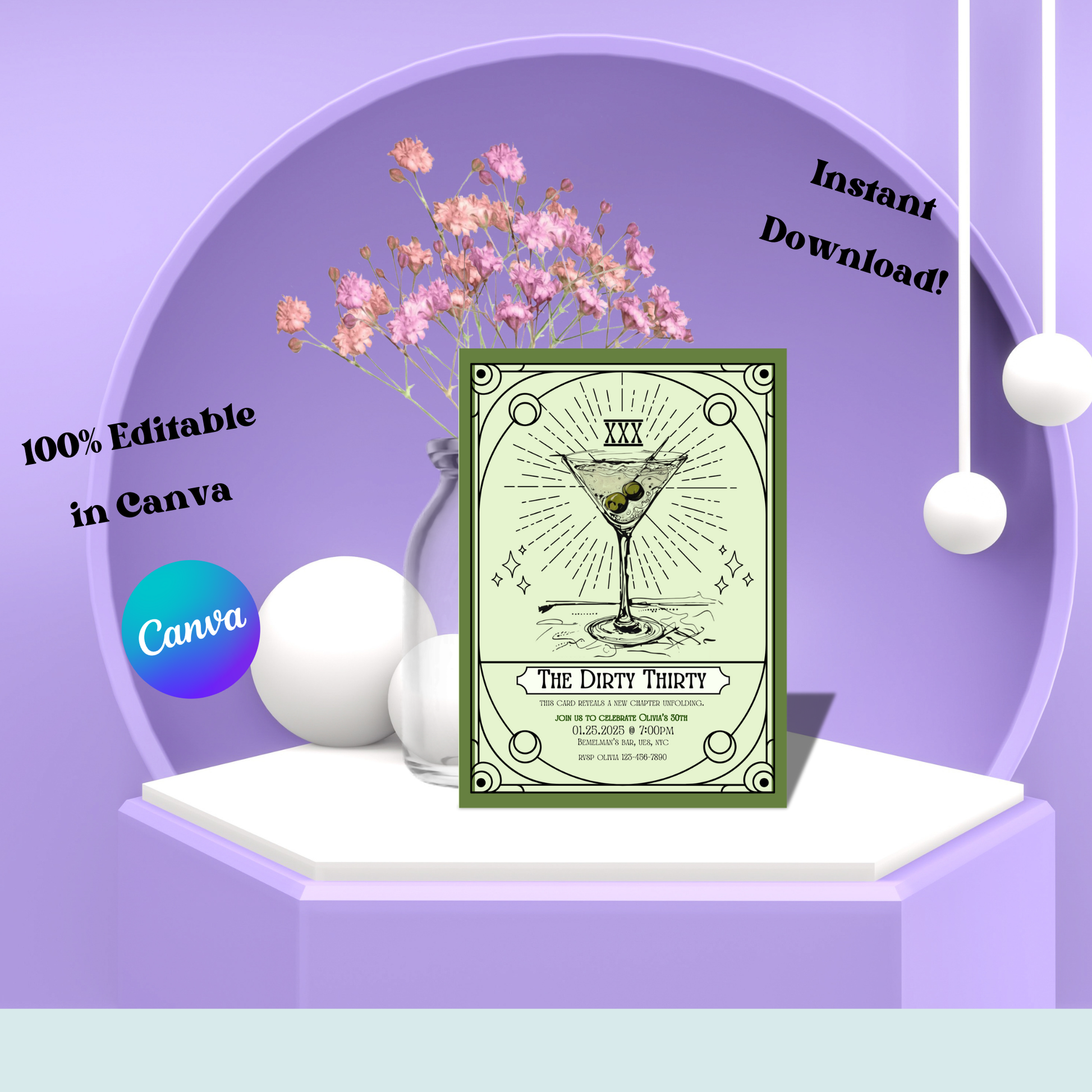 Raise a glass to turning 30 in style! πΈβ¨ This Dirty Thirty Tarot Invitation is perfect for celebrating a milestone birthday with a mystical twist. Featuring a chic martini illustration, Art Deco borders, and elegant green tones β this invitation sets the mood for a classy cocktail night or bar celebration. So whether you're a fan of the occult or a good dirty martini, this invitation will set the most magical, mystical witchy vibes.Β