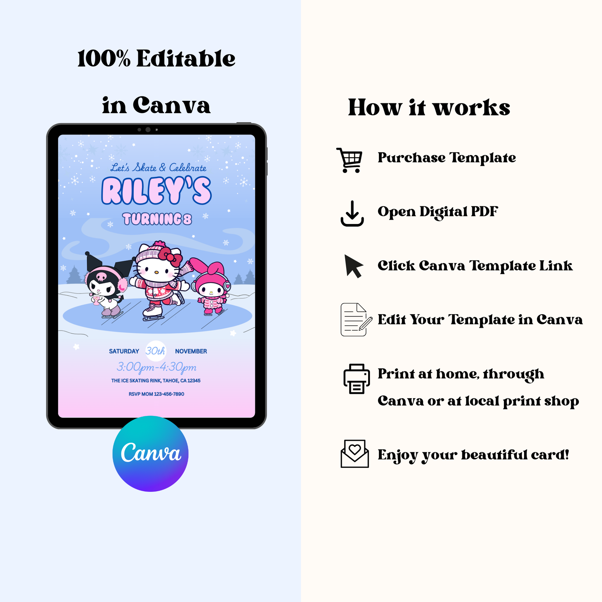 Hello Kitty Ice Skating Birthday Invitation, Editable Template, Instant Download 5x7
